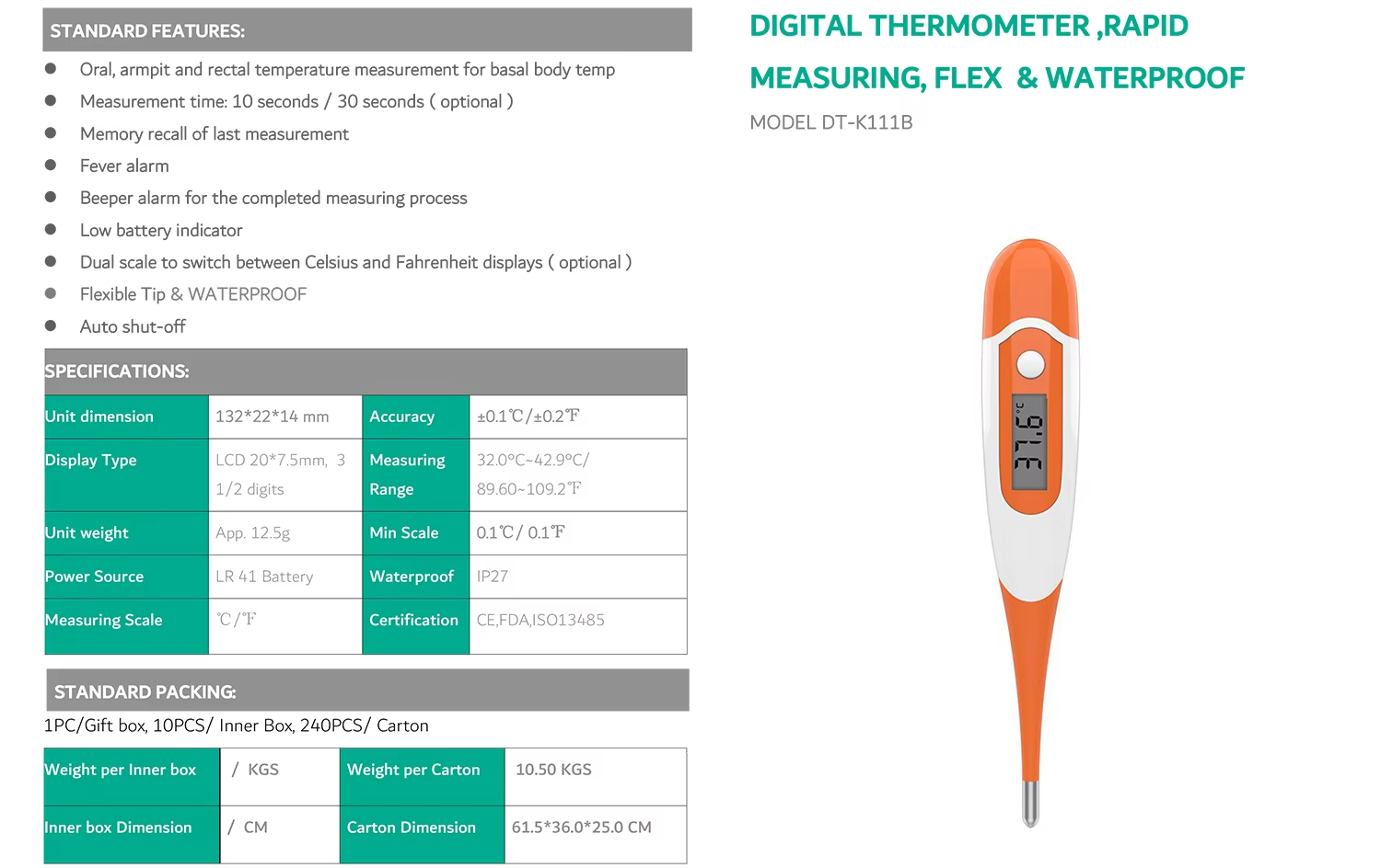 Ⅰ.Beeps when Ready Ⅱ.Last Readout Memory Ⅲ.Automatic power off Ⅳ.Easy to use Ⅴ.Convenient to carry Ⅵ.No risk of allergic reactions Ⅶ.Durable Rigid Tip Ⅷ.Continuous Accuracy |