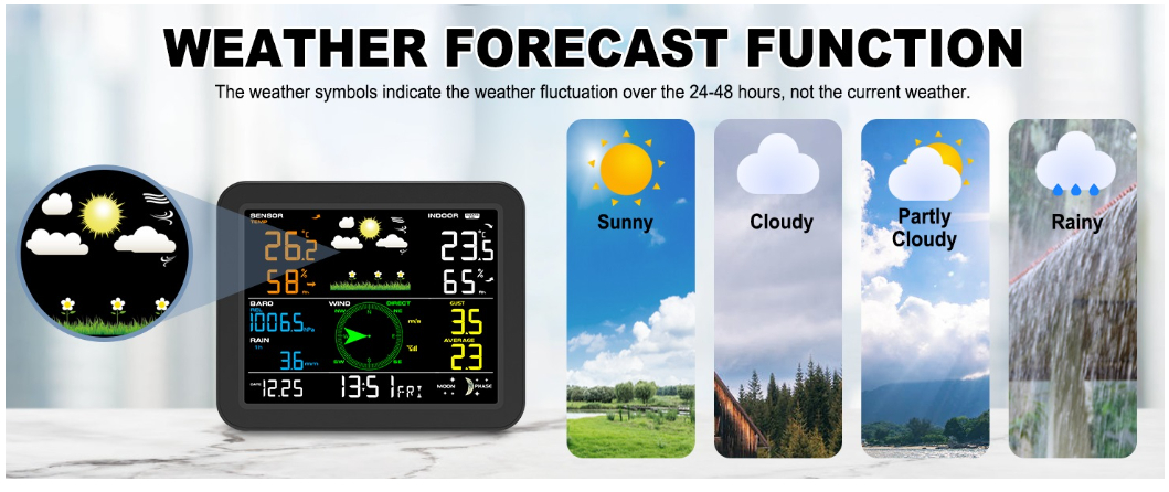 8. Weather forecast (Sunny, partly cloudy, Cloudy, Rainy), Moon Phase