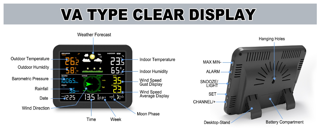 6. Wind speed and gust display(m/s, km/h, mph, knots bft) – Hi alarm