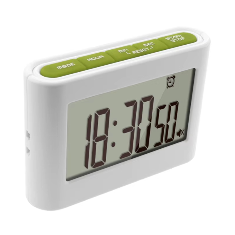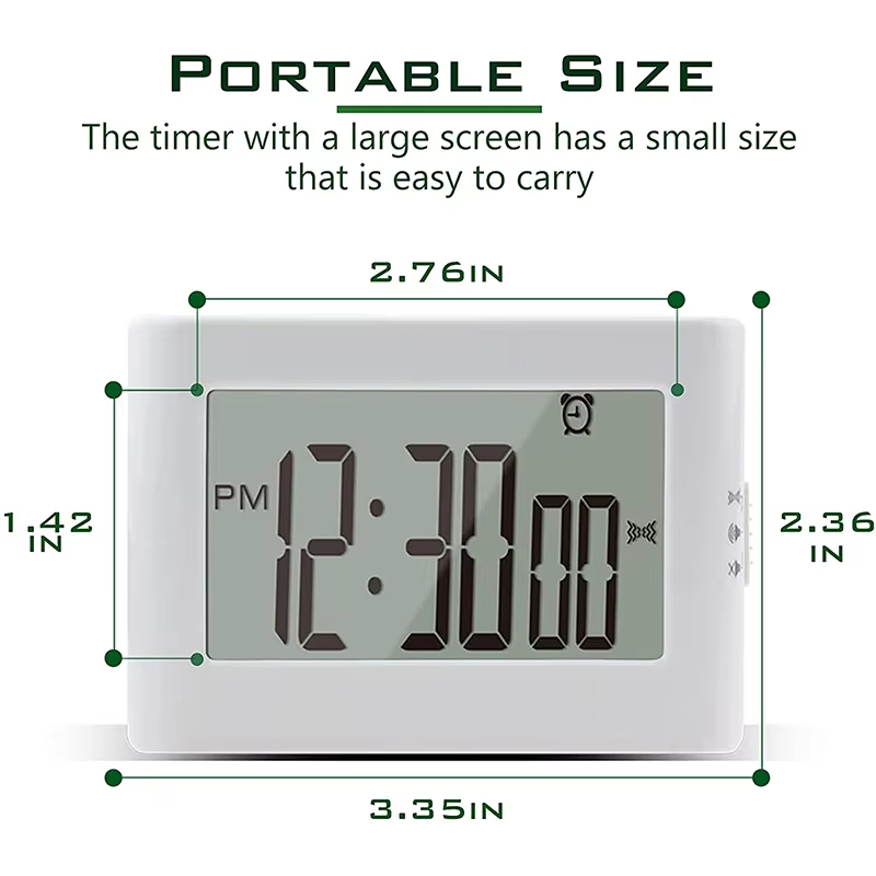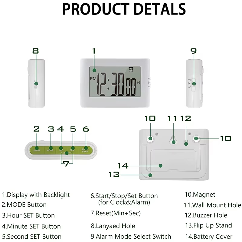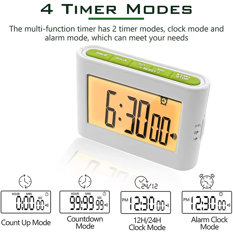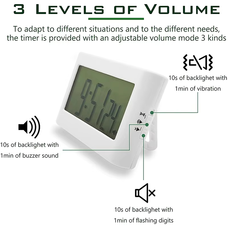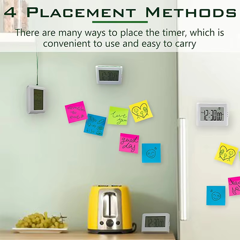 | Functions | 24 hour Countdown 24 hour Count up Time Mode 12/24 time format Alarm clock mode Fridge magnet Support stand Buzzing alarm Vibrating alarm Light flashing alarm Mute mode |