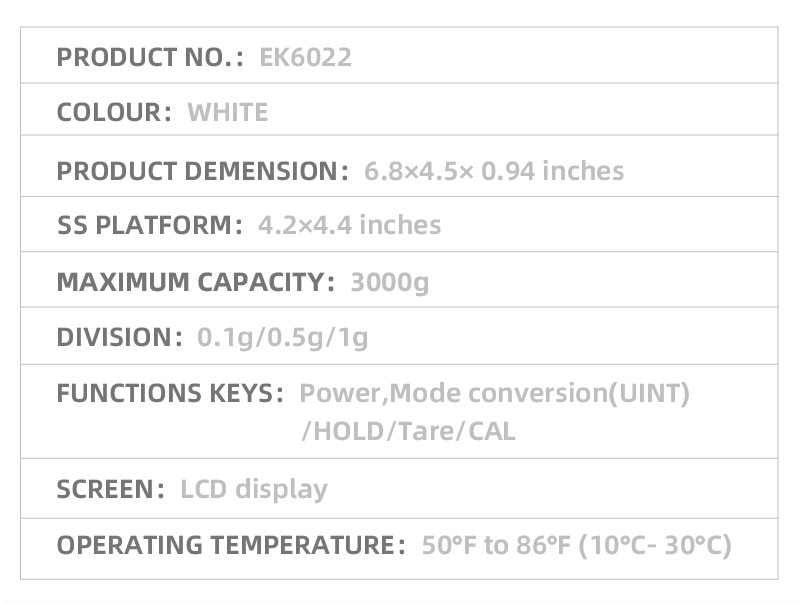 | Division | C=0.3~200g,d=0.1g, C=200~1kg,d=0.5g, C=1-3kg,d=1g |