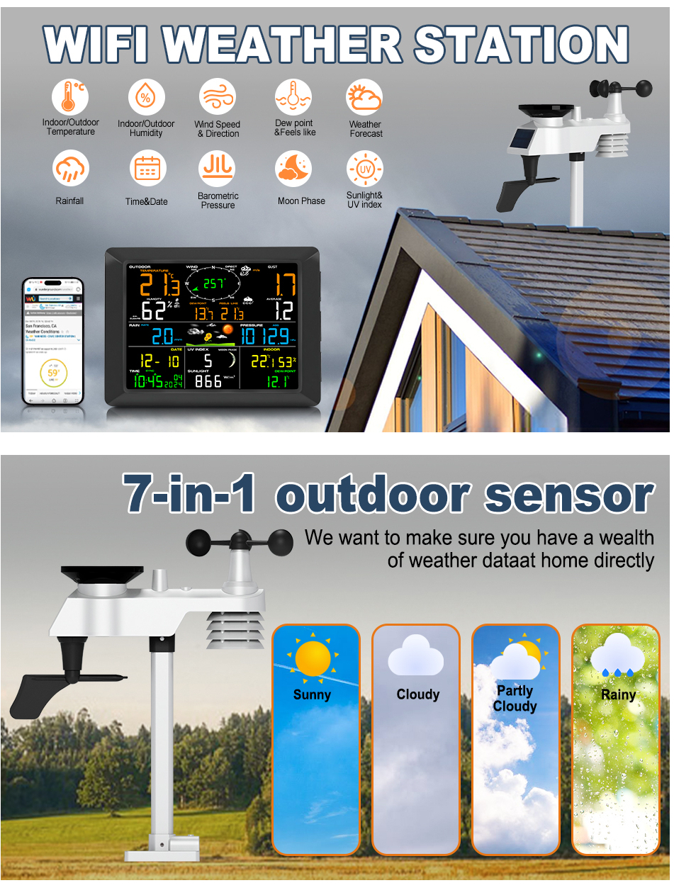 8. Weather forecast (Sunny, partly cloudy, Cloudy, Rainy), Moon Phase