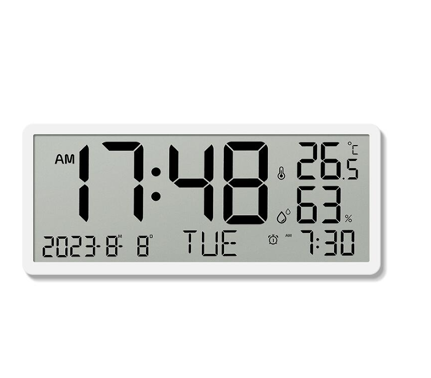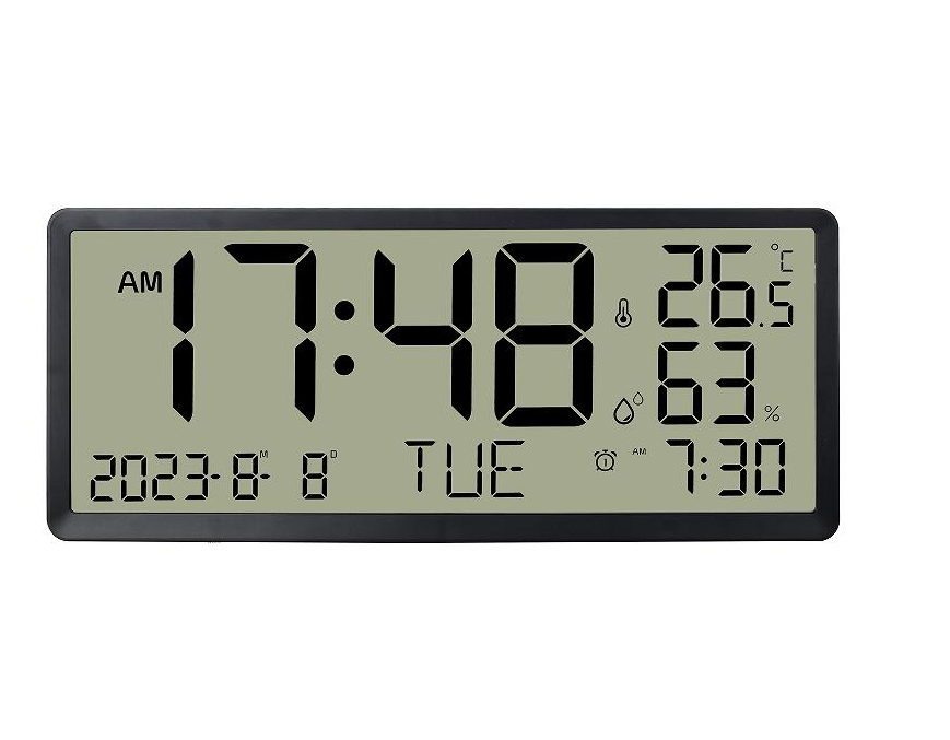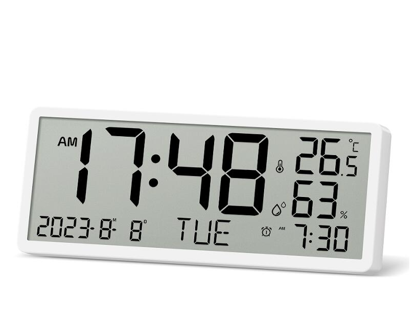 1. Wall Large Digital Clock with Fold-out Stand - Digital Clock for Wall or Desk. The clock comes with a mounting template ruler showing 8.7 inches distance between two mounting holes, so you don't need to measure holes on wall. The large display helps you read the time from many angles at a room distance. You can also read the indoor temperature & humidity and date on screen for full information.