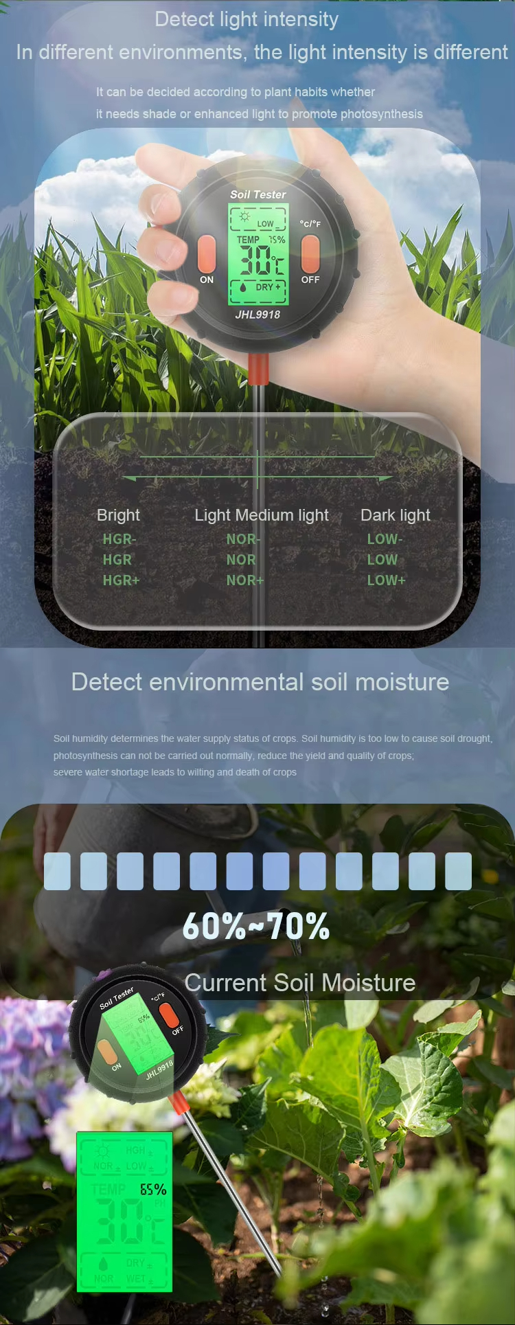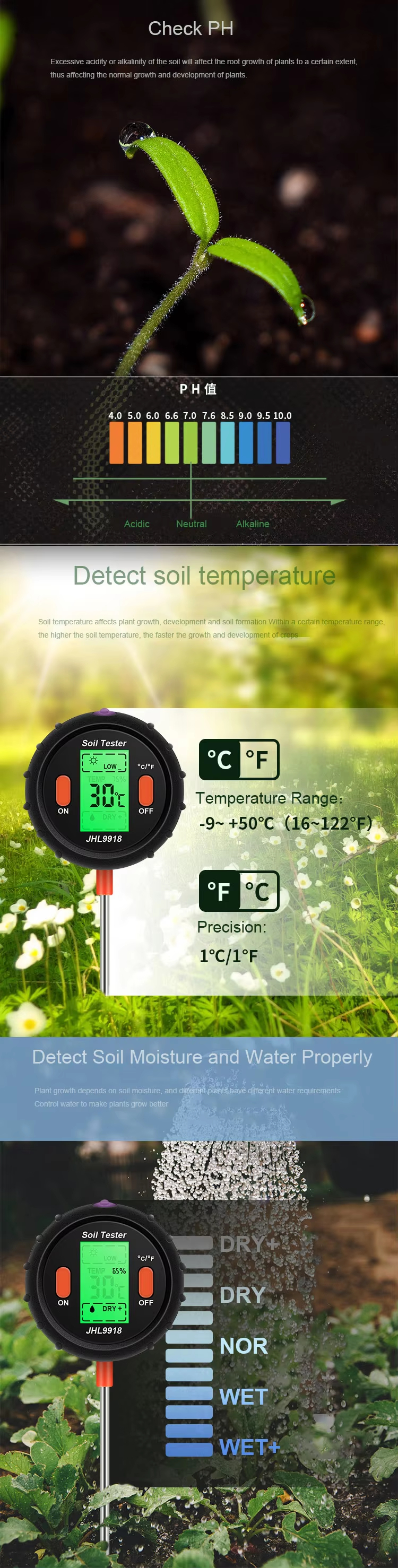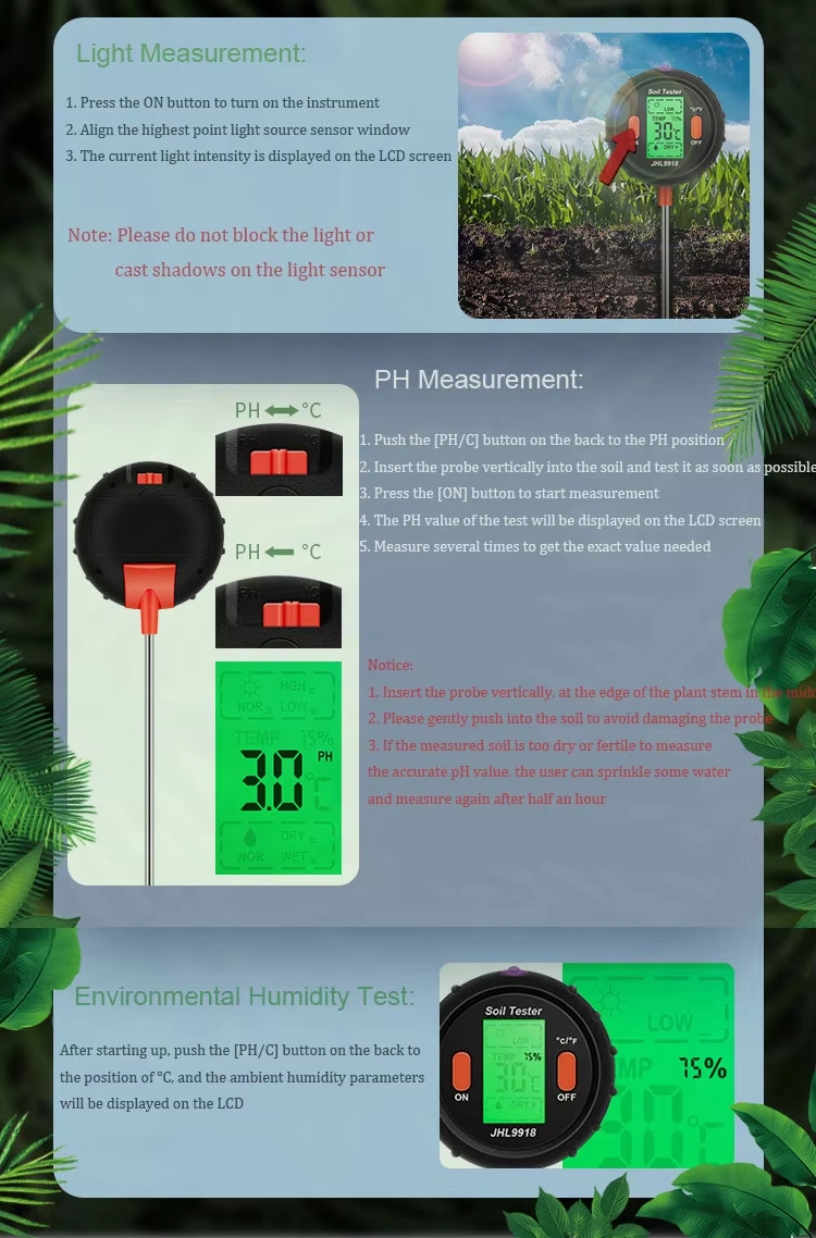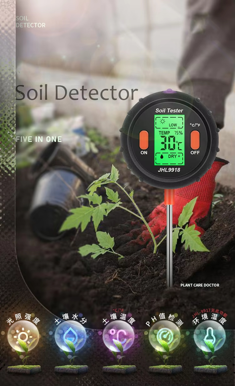 JHL-9918 Best Digital 5In 1 Soil Ph Meter Professional Lcd Display Temperature Moisture Sunlight Ph Garden Plants Soil Tester Meter