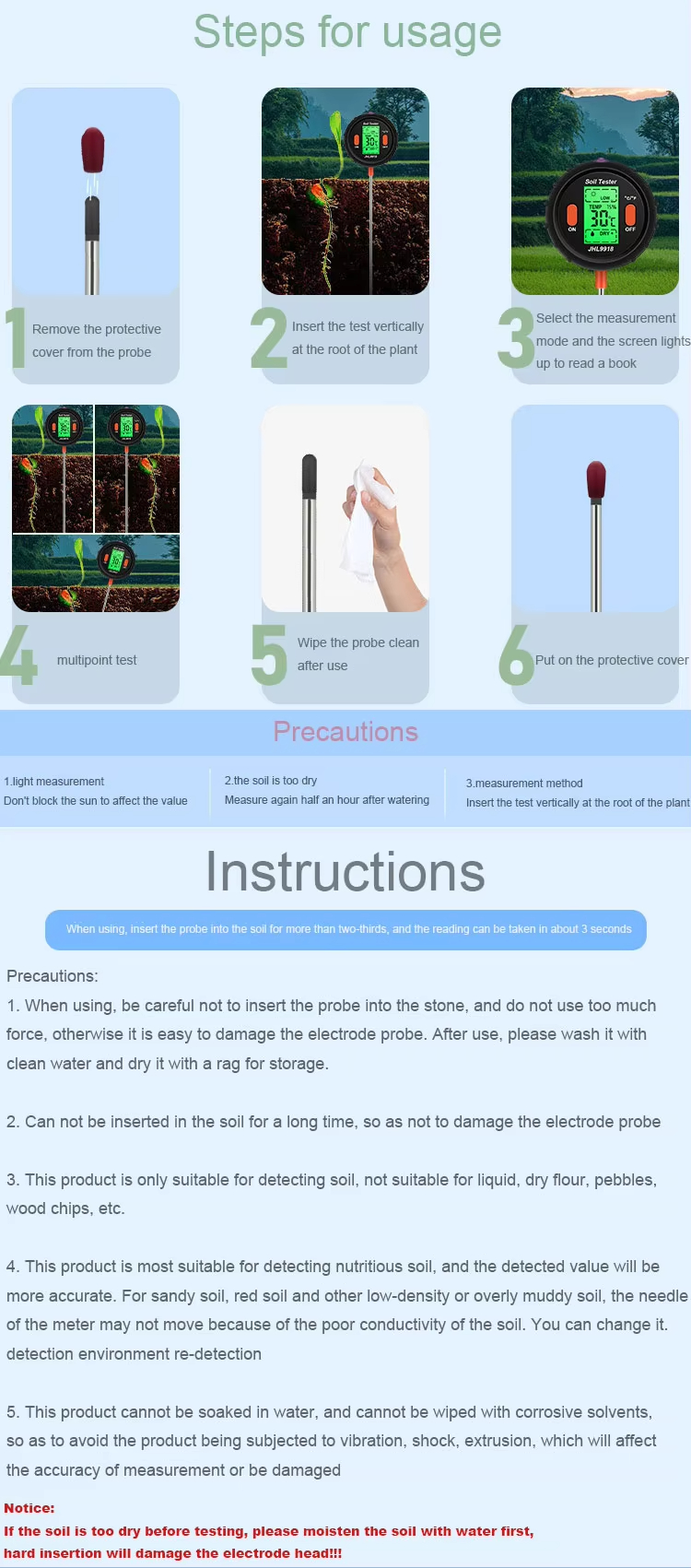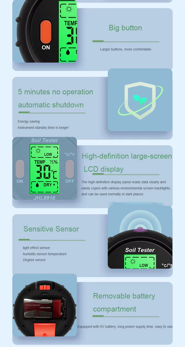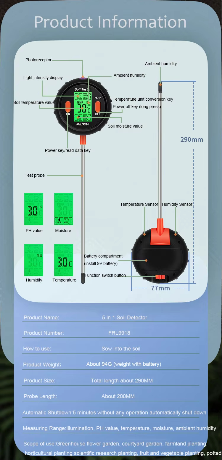 JHL-9918 Best Digital 5In 1 Soil Ph Meter Professional Lcd Display Temperature Moisture Sunlight Ph Garden Plants Soil Tester Meter