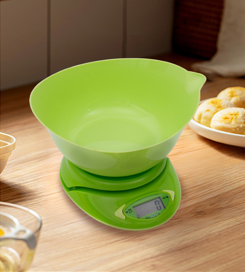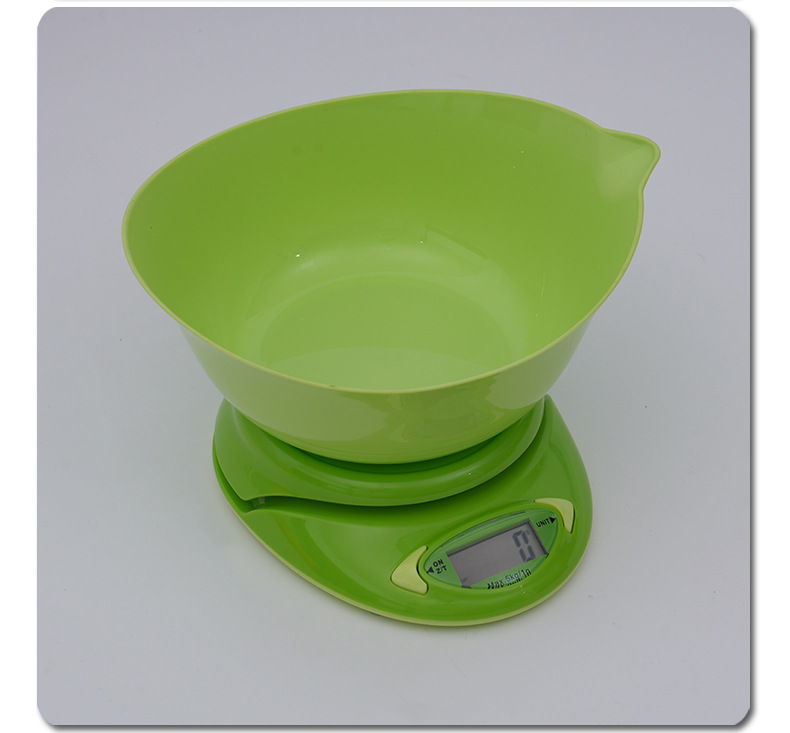 Size: 185*150*40MM Bowl size and capacity: 220x220x95mm 2.2L Range: 5kg/1g Unit: g/lb/oz/kg. LCD size: 38x16mm. Automatic shutdown. Battery: 2pcs x 3V CR2032 button batteries.
