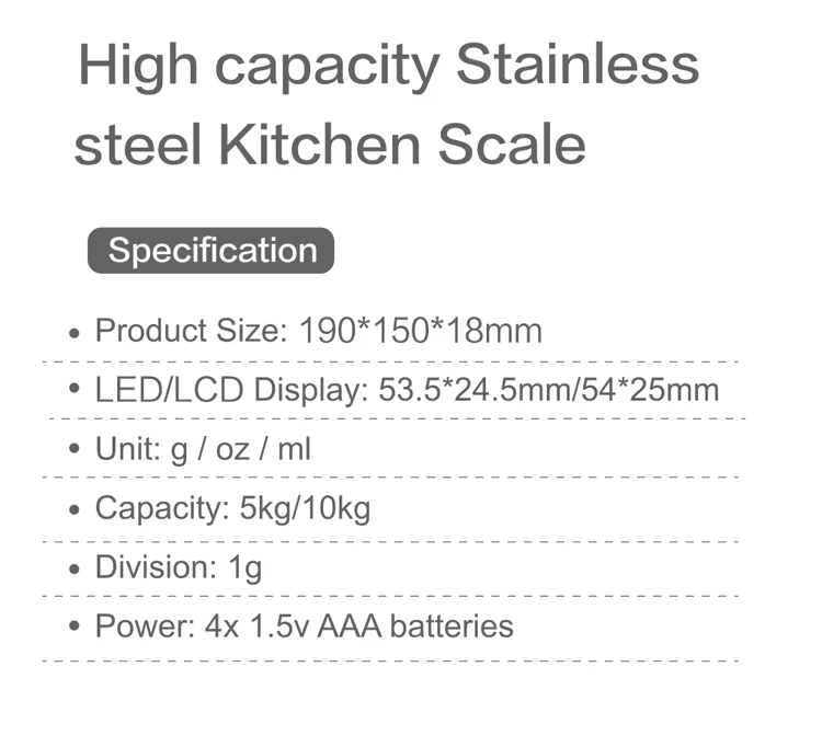 Battery type | 4x1.5v AAA batteries(included) | Capacity | 5kg/10kg/15kg |