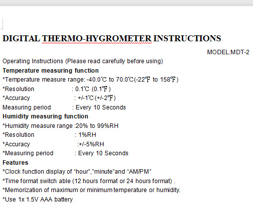 *Temperature measure range:-40.0℃to 70.0℃(-22F to 158F)