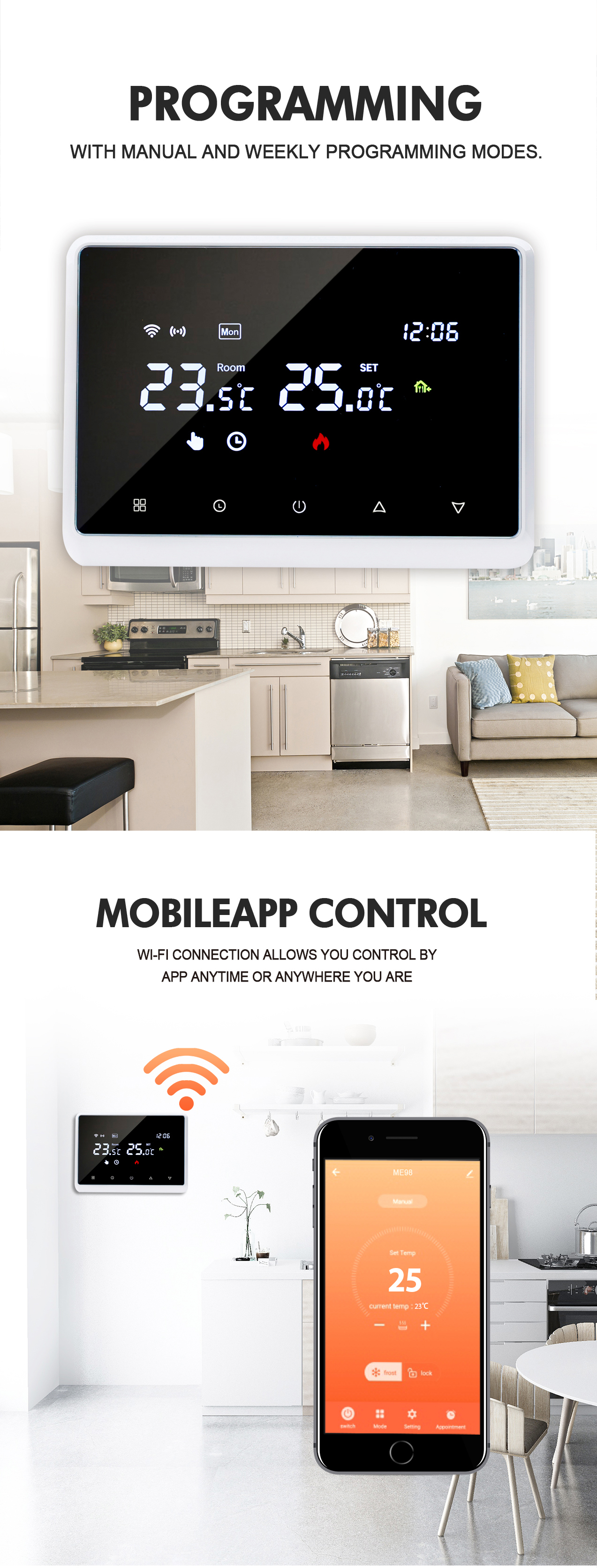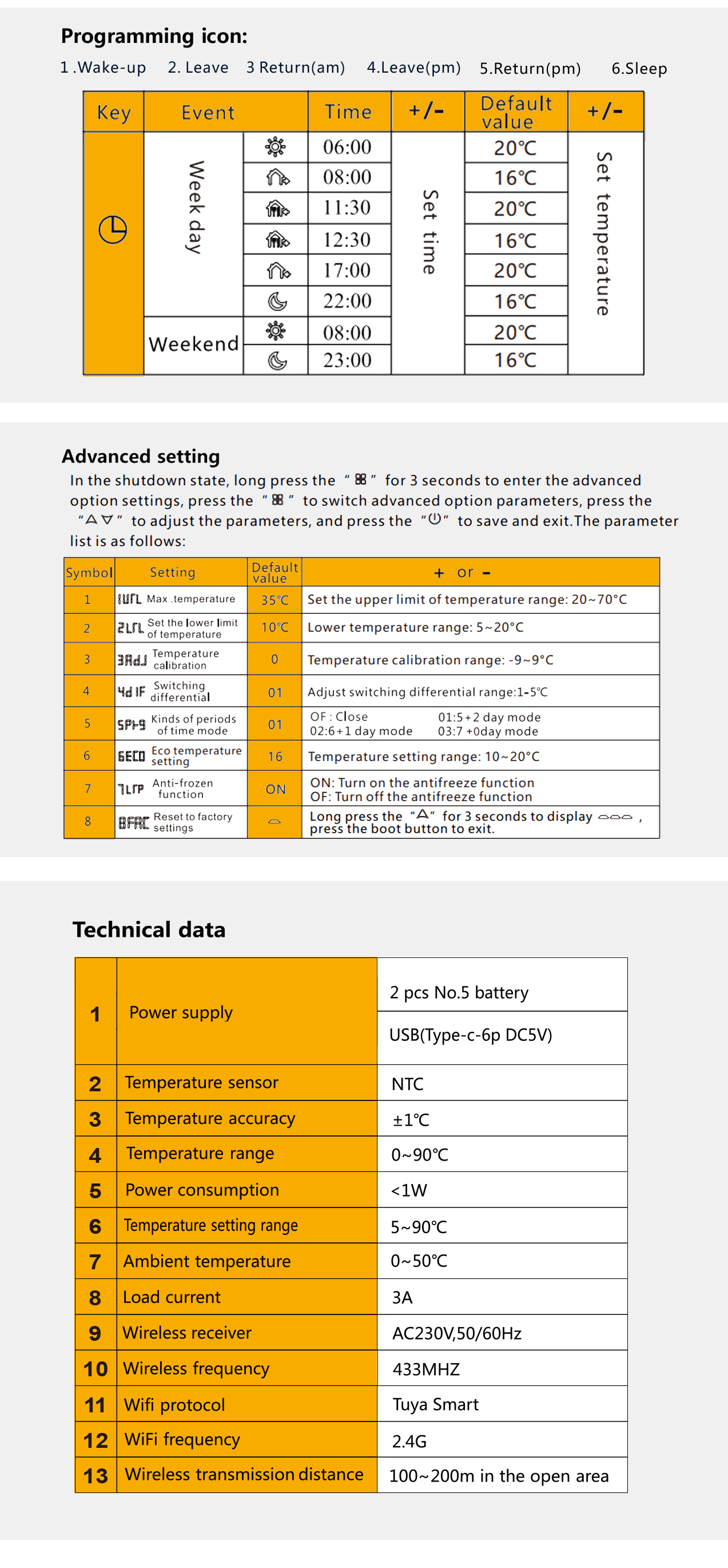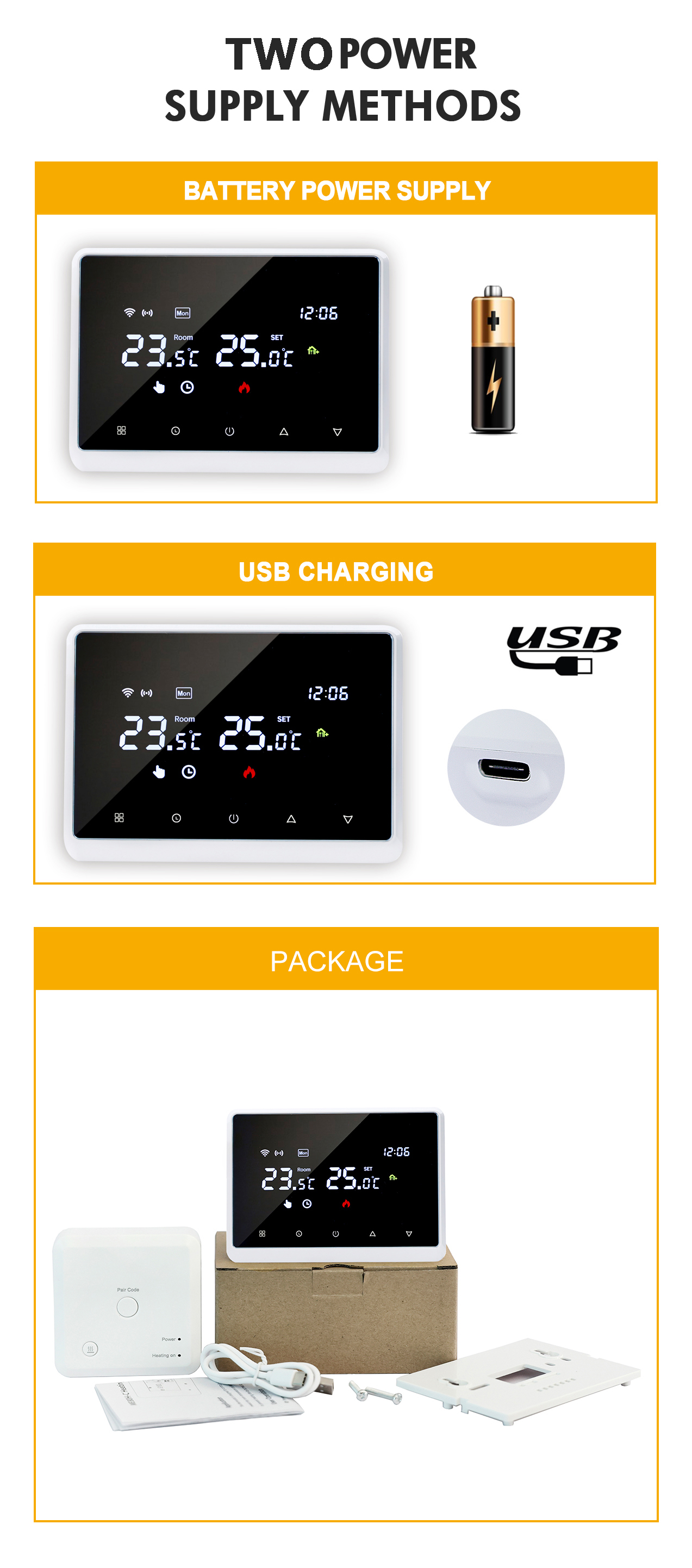 | Power Supply | Thermostat Panel: 2×AA Batteries(cannot support WiFi) , USB (TypeC-6p DC5V) | ||