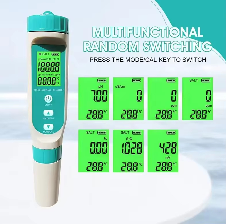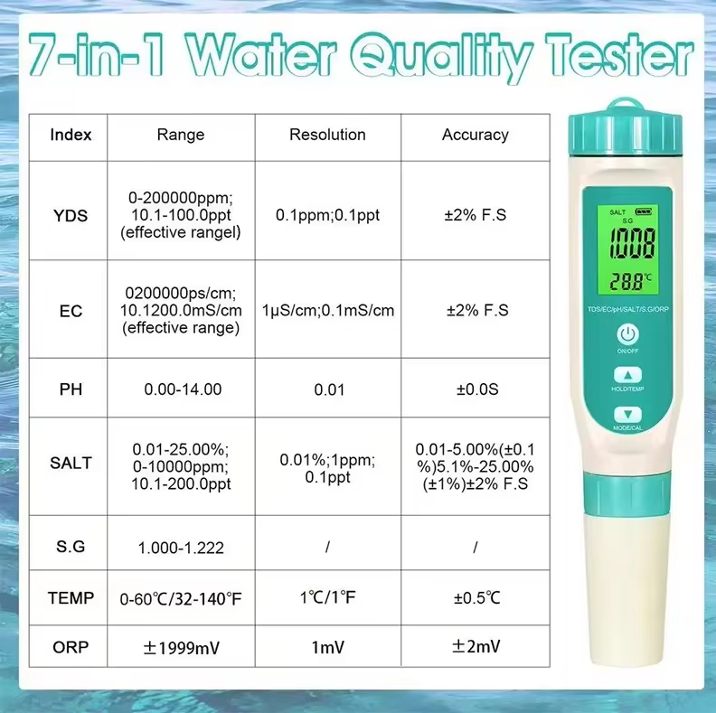 7 in 1 Functionality: Measures TDS, EC, pH, SALT, ORP, S.G., and TEMP for comprehensive water analysis.