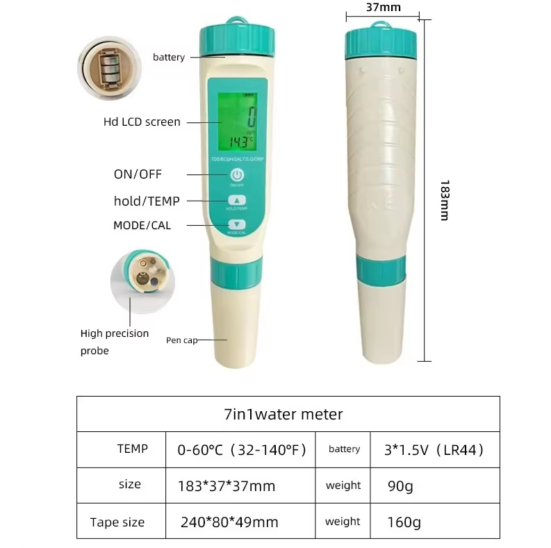 portable 7 in 1 water quality meter for aquarium and hydroponics digital pH TDS EC SALT TEMP ORP S.G tester pen for lab and drinking water high precision multiparameter water tester for aquaculture and pools handheld water quality pen 7 in 1 for professional and home use multi-function water tester for pH TDS EC SALT TEMP ORP S.G measurement