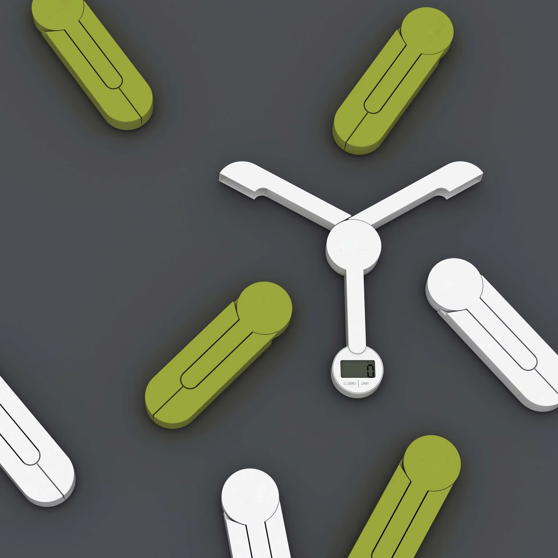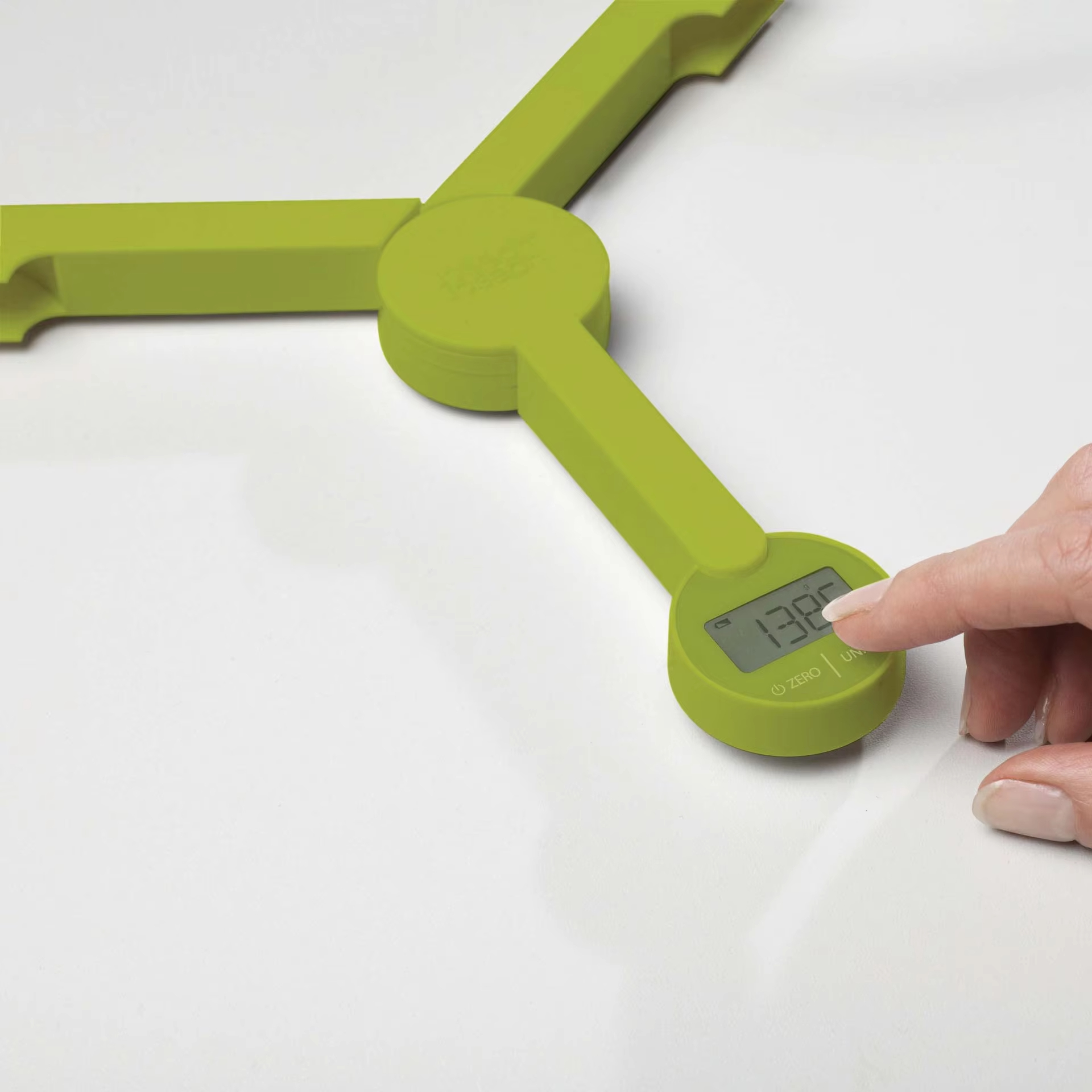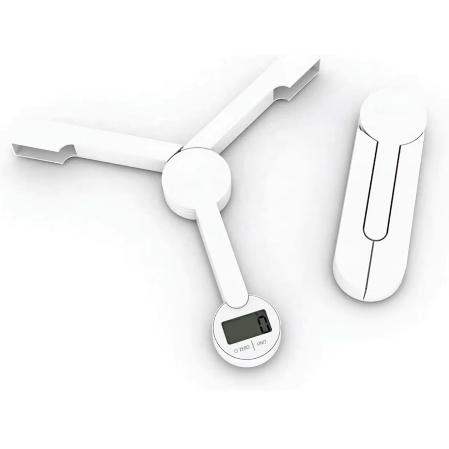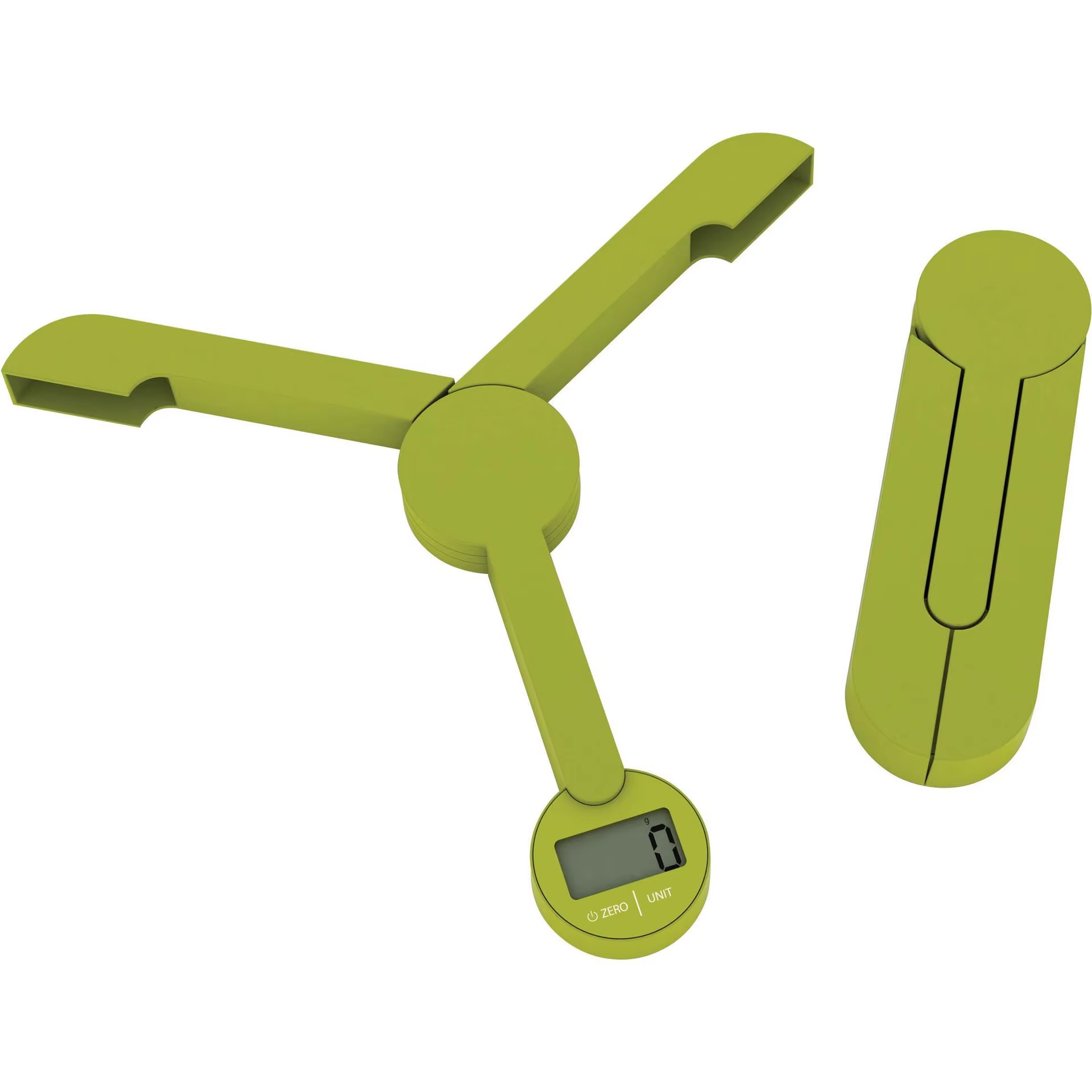 When opened, its three arms provide a stable platform on which bowls and other items can be placed for weighing. When closed, the device can be folded into a very compact size to enclose and protect the screen and controls, making it perfect for storage and carrying.