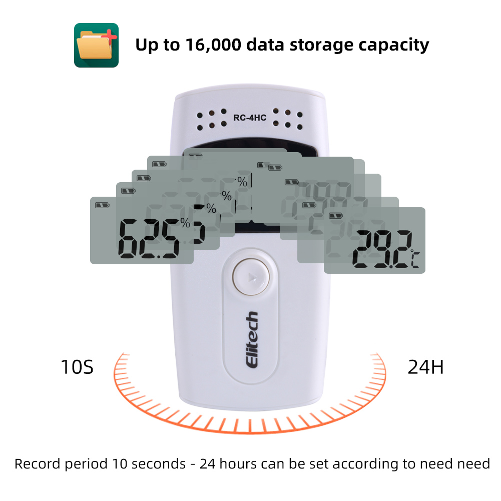 The data logger display interfaces includes: temperature status display, humidity status display, record capacity display, time display, date display, Max. temperature display, Min. temperature display, Max. humidity display, Min. humidity display.