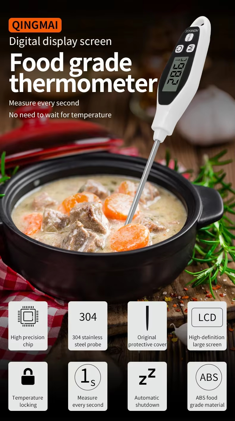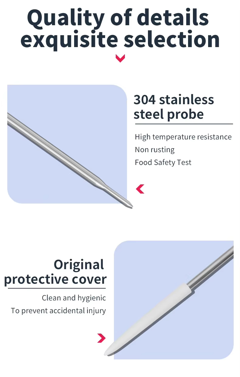 Yapımı gıda sınıfı malzemelerden yapılmıştır, gıdayla temas etmeye güvenlidir ve ilgili güvenlik standartlarını karşılarBu ürün, çeşitli yiyeceklerin sıcaklık ölçümü için kullanılabilir, bu sayede kullanıcılar endişe etmeden kullanabilirler