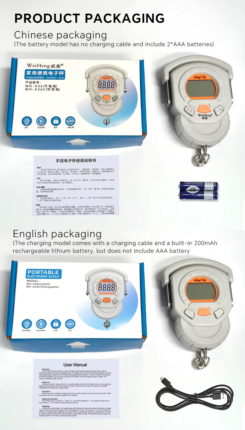 WH-A36 Weiheng 60kg Portable Handheld Electronic Hanging Scale Rechargeable Digital Baggage Hook Scales