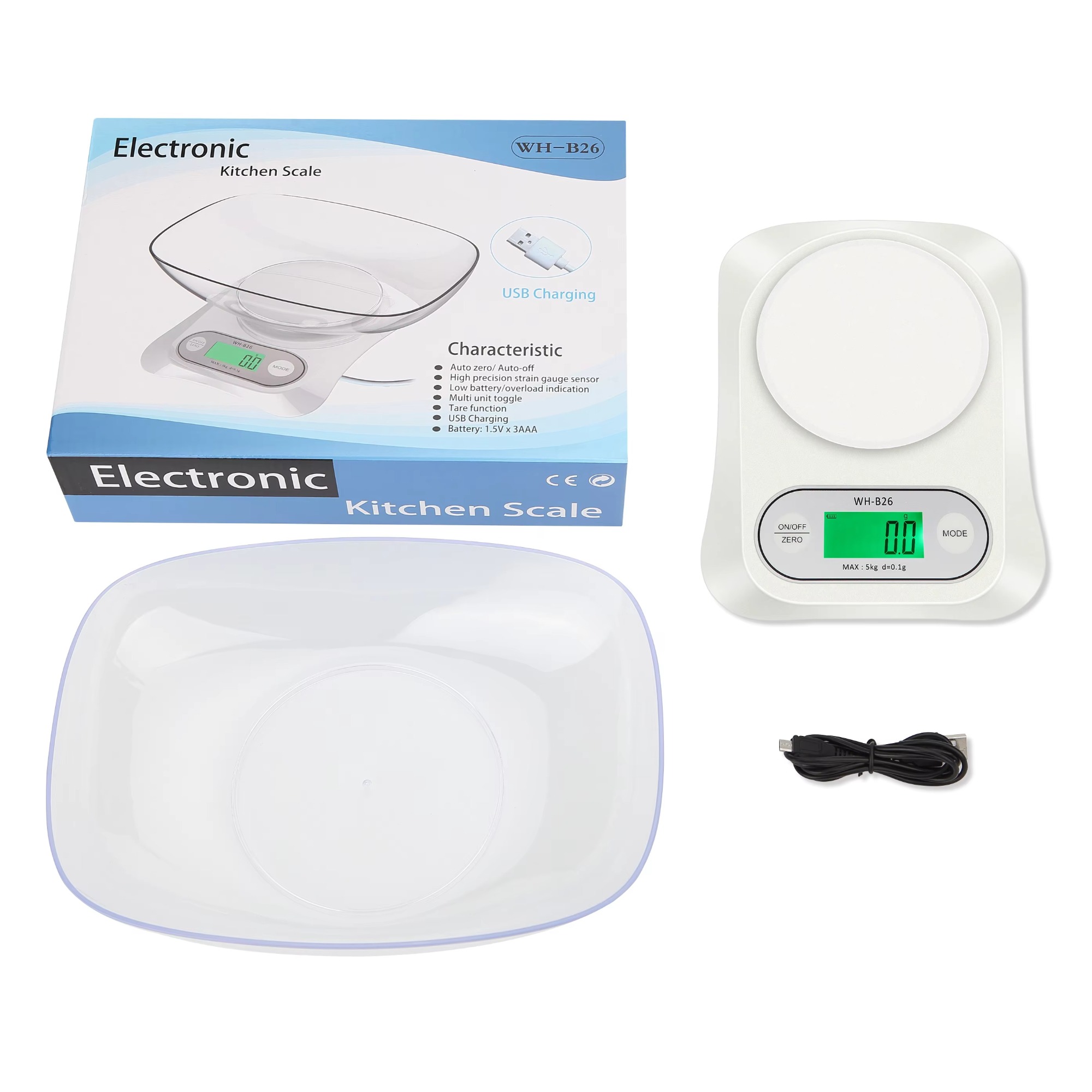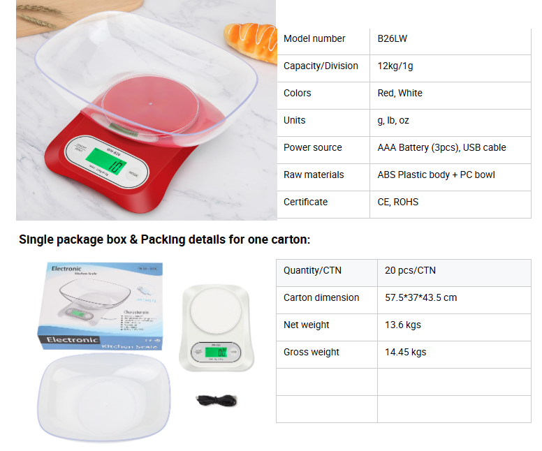 WH-B26 12kg/1g Big Bowl USB Rechargeable 12kg Food Weighing Scale Digital Kitchen Scale 12000g 5000g/0.5g
