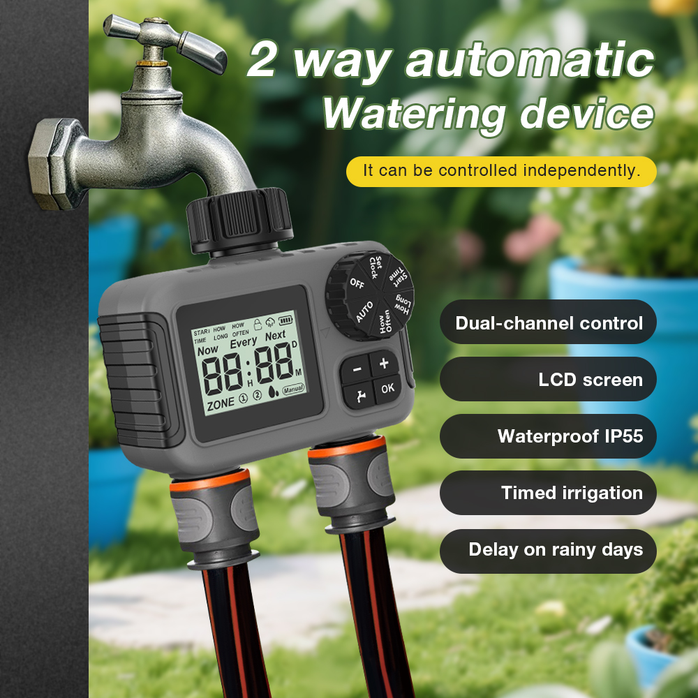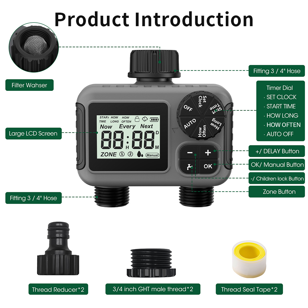 1. Maximum watering time 5H59M, watering frequency 1H-23H-7Days, and ZONE1 ZONE2 can set watering time and frequency independently;