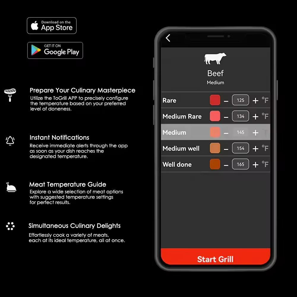 Precision Dual Sensors: Food-grade probes track internal cooking temperatures up to 212°F and ambient temperatures up to 527°F.
