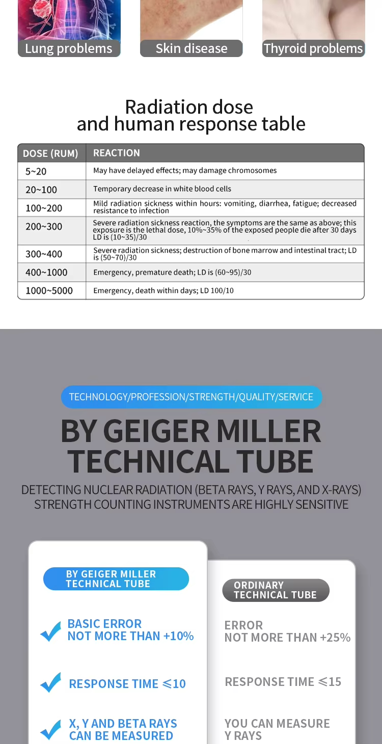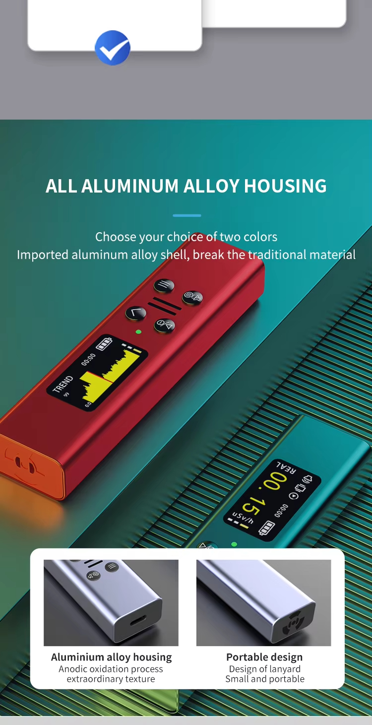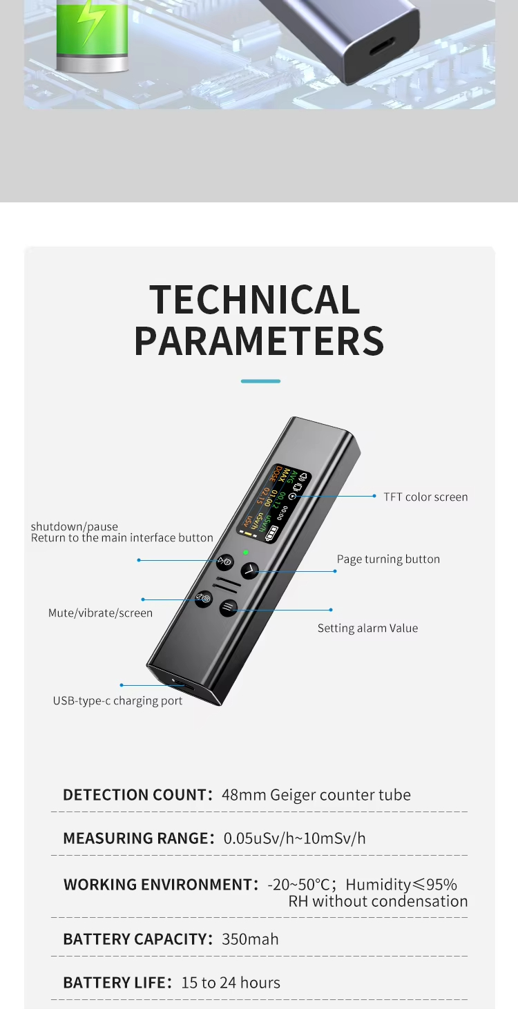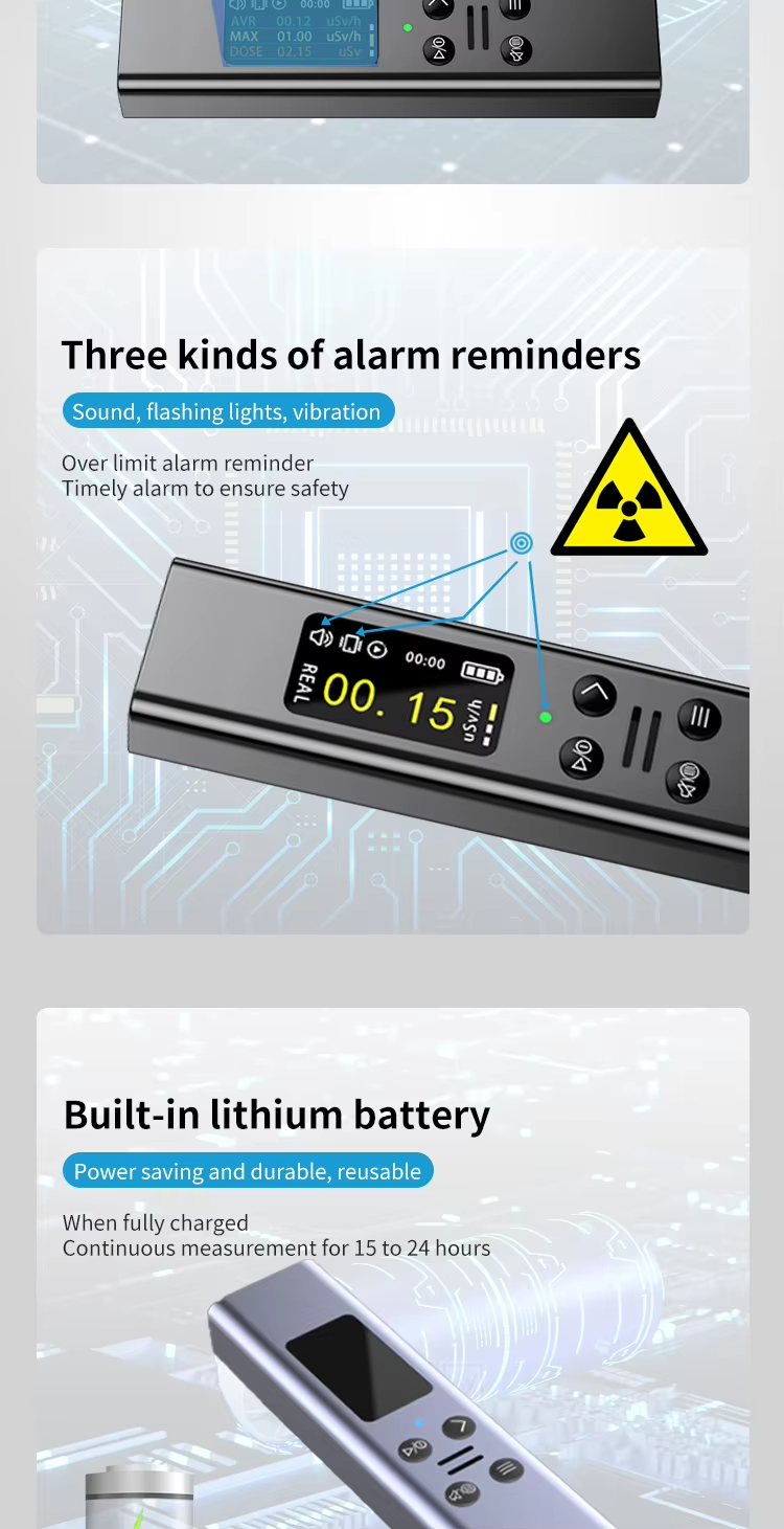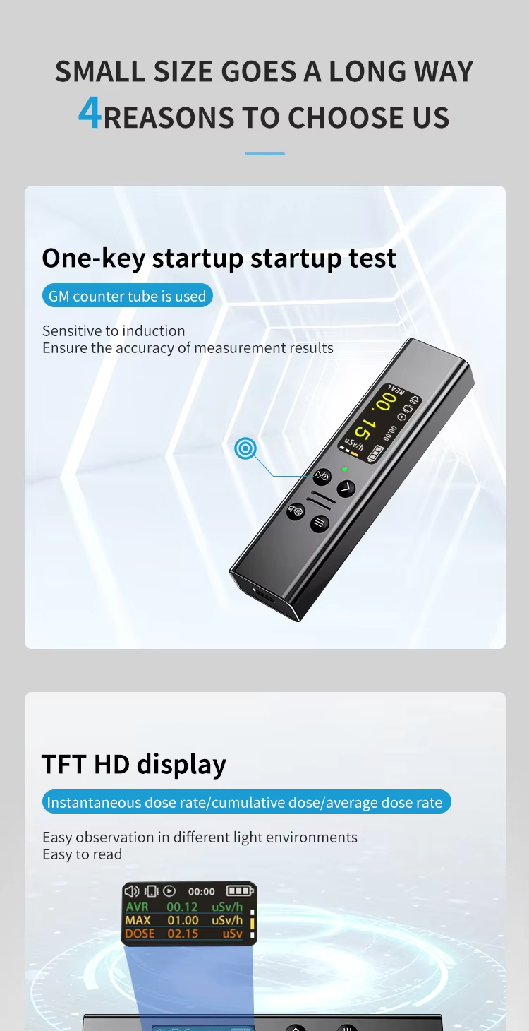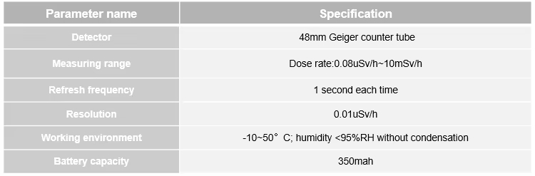 This nuclear radiation dosimeter is a high-sensitivity X, Gamma and beta ray dosimeter with alarm. It uses an energy-compensated GM Geiger-Mueller counter tube as sensor, which has the characteristics of high sensitivity, strong anti-interference ability and accurate measurement. Powerful microprocessor and TFT screen are adopted to realize easy operation. There are three modes for alarm, namely sound, flash and vibration, what’s more, the alarm threshold is adjustable.