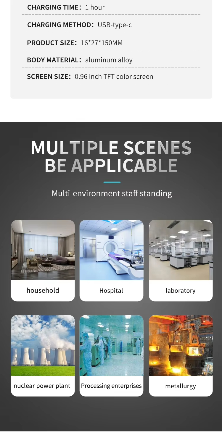 The radiation dosimeter have wide range and it can be used to detect radiation in home decoration radiation, irradiation processing enterprises, health and epidemic prevention, radiotherapy, nuclear power plants, import and export commodity inspection, building materials, petrochemical, geological census, scrap steel, industrial non-destructive testing and other ionizing radiation environment.