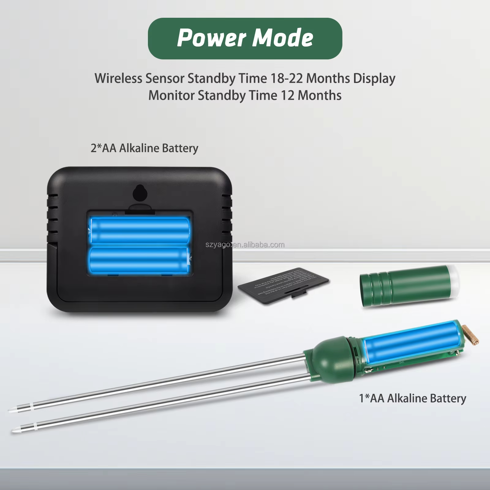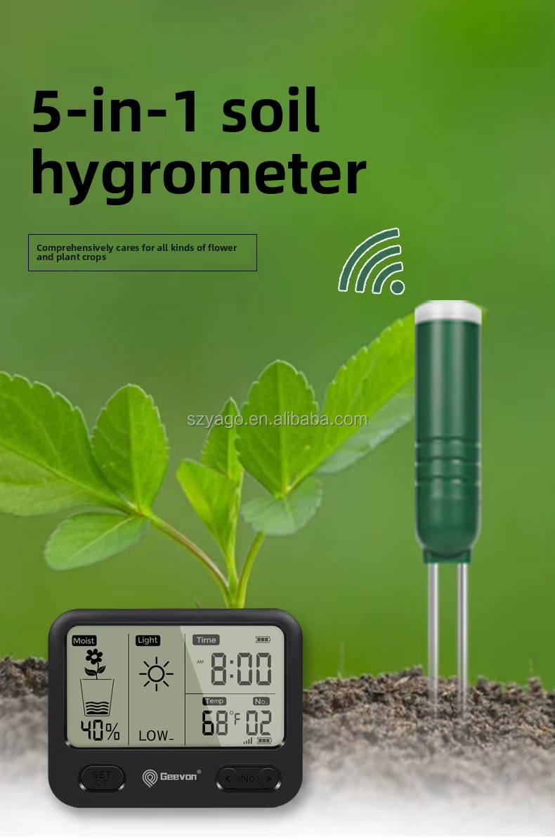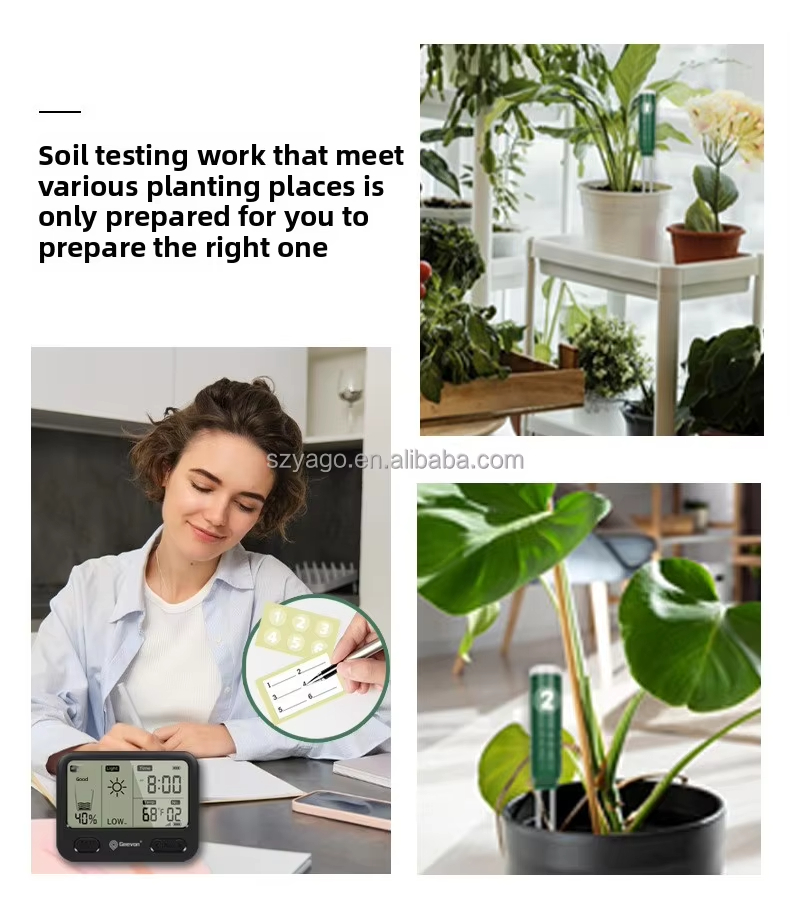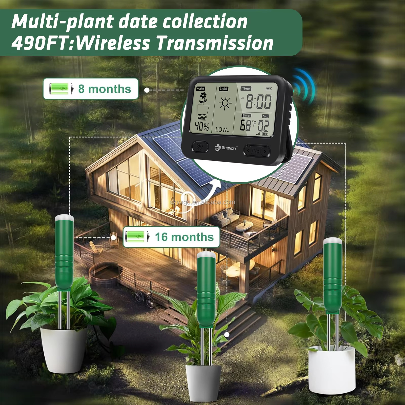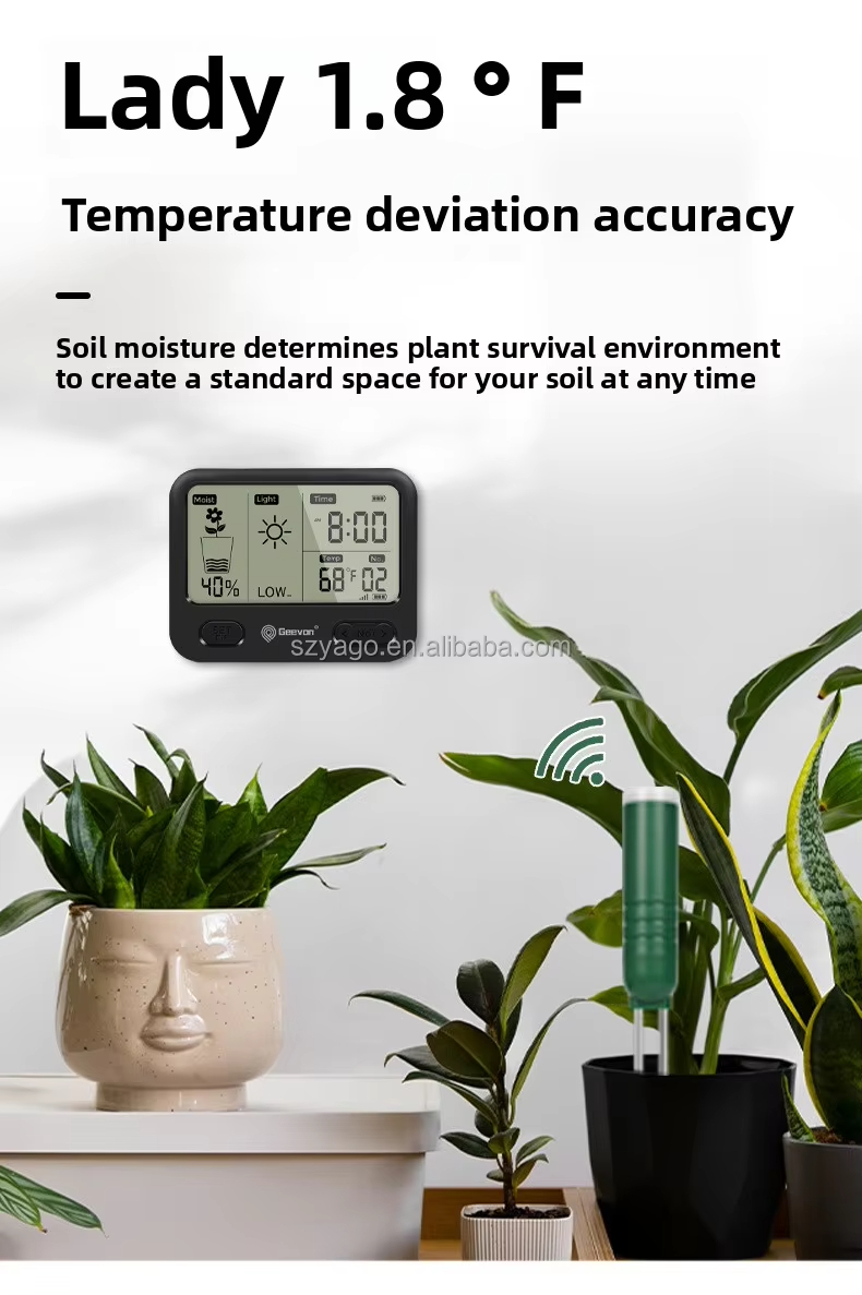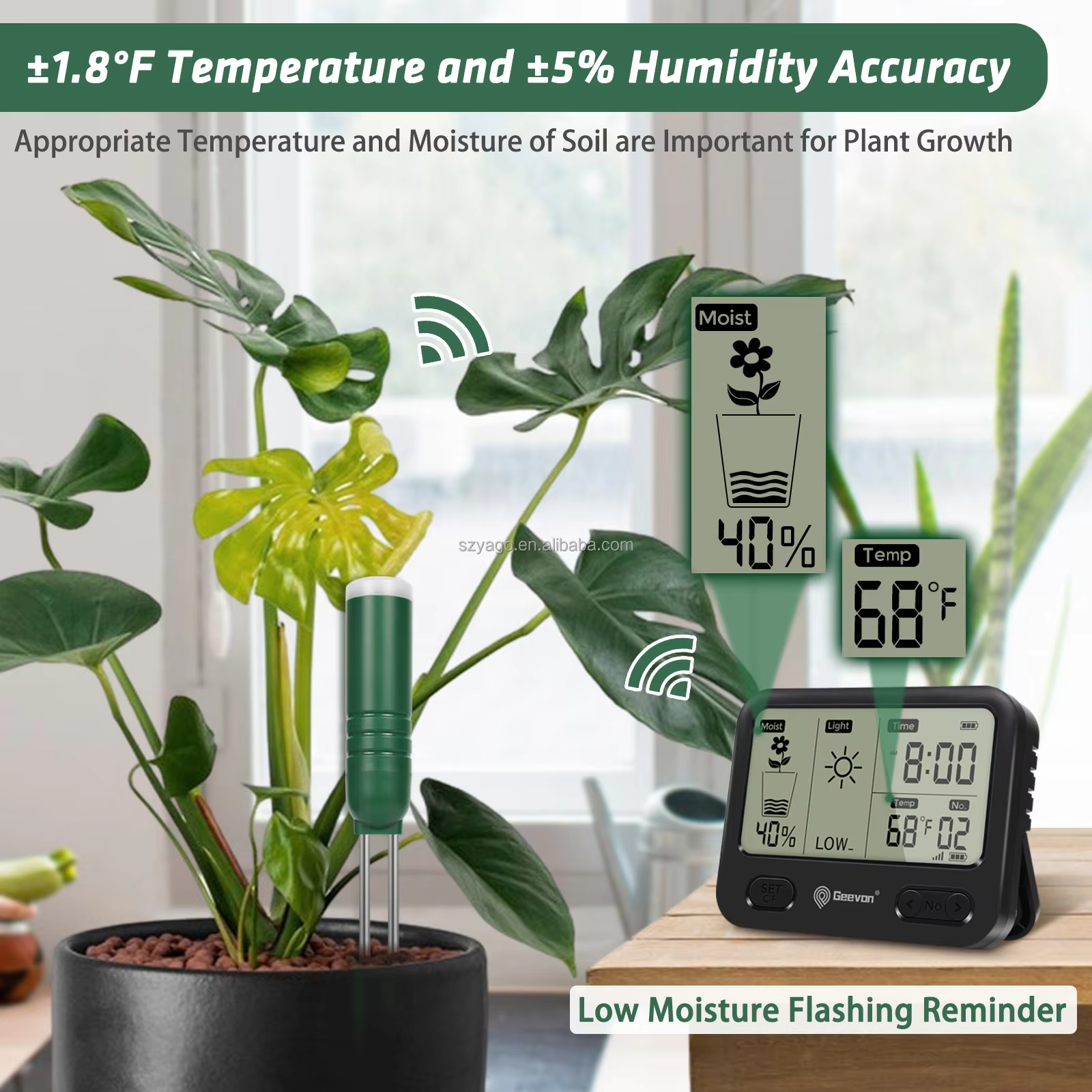 5-in-1 Detection Functionality Measures soil moisture, temperature, humidity, sunlight, and displays real-time time info on screen. Supports up to 6 Waterproof Sensors (IPX5) Monitor multiple areas or plants simultaneously with reliable, rainproof sensors. Large 4-Inch LCD Display Clear, high-contrast screen shows moisture %, light level, temperature (°F/°C), humidity, and time. High Accuracy & Smart Alerts Temperature ±1.8°F, humidity ±5%; includes out-of-range and low moisture reminders. Switchable °C/°F & 9-Level Light Detection Easily toggle between Celsius and Fahrenheit; precisely monitor sunlight exposure for photosensitive plants. |