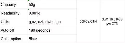 - Readability: 0.001g / 0.0001oz / 0.005ct / 0.02gn / 0.0001ozt / 0.001dwt