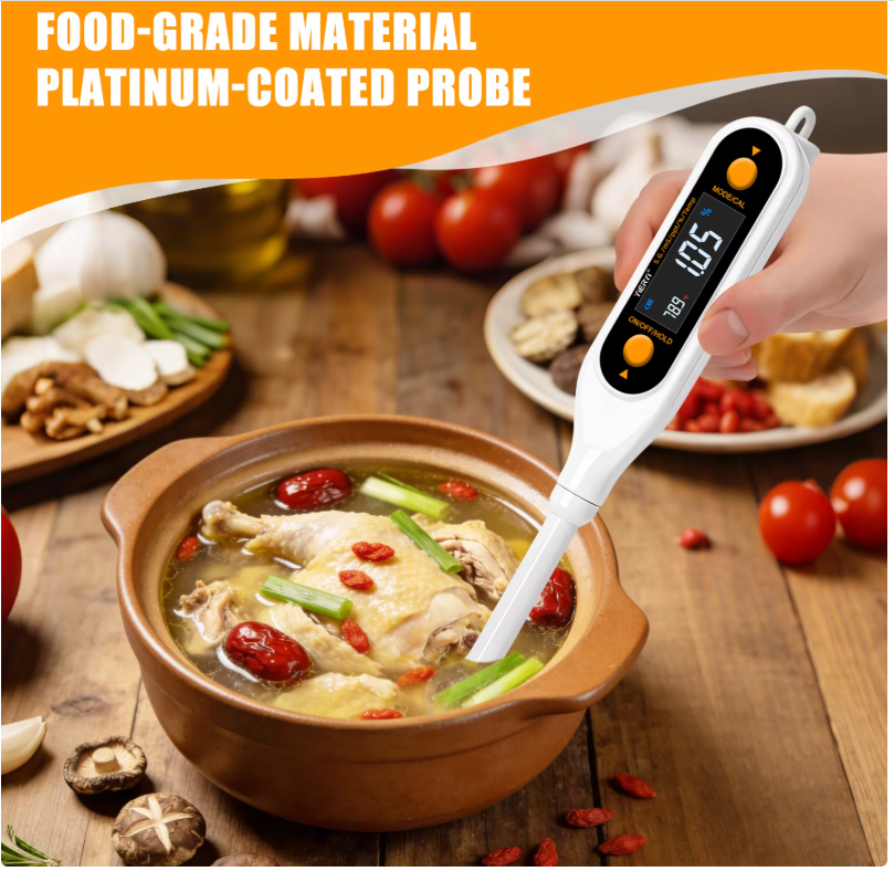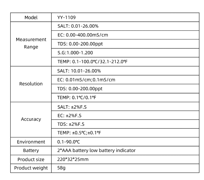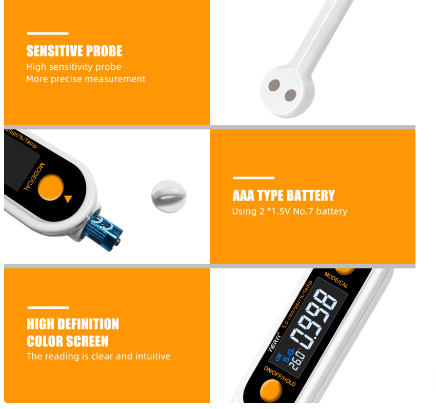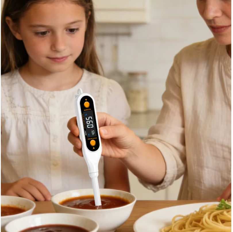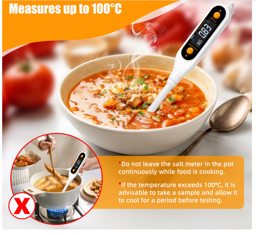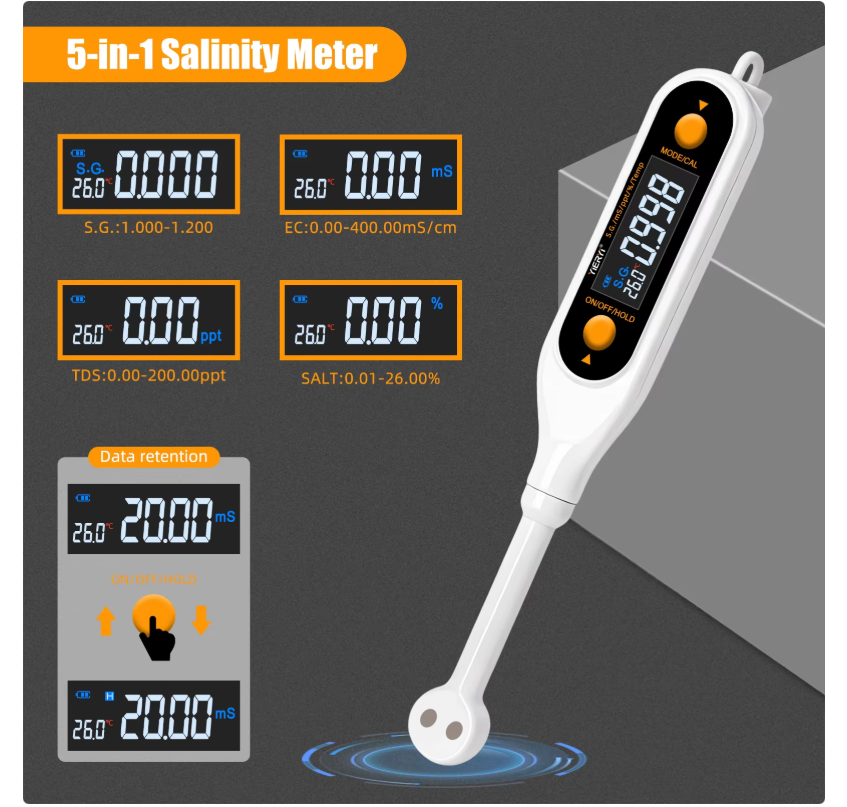 This is the 5-in-1 Food Salinity Meter, specifically designed for kitchens to accurately measure the salinity, TDS, EC, SG, and temperature of foods like soups, marinades, and sauces. Its core advantages include: High-Precision 5-in-1 Food Salinity Meter for Soups and Marinades Durable Handheld Food Salinity Meter for Sauces and Brines Multi-Scene Food Salinity Tester for TDS EC SG and Temperature Measurement